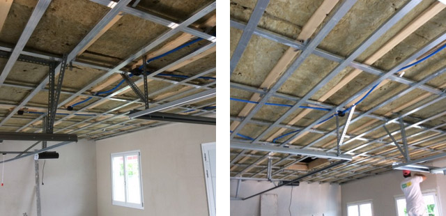 Mit Metallprofilen wird ein Deckenrost erstellt und anschliessend mit Gipskartonplatten beplankt. Die Decke wird abgehängt und es können jegliche Beleuchtungskörper, Lautsprecher und andere Bauteile eingebaut werden. Deckengewölbe sind ebenfalls möglich.